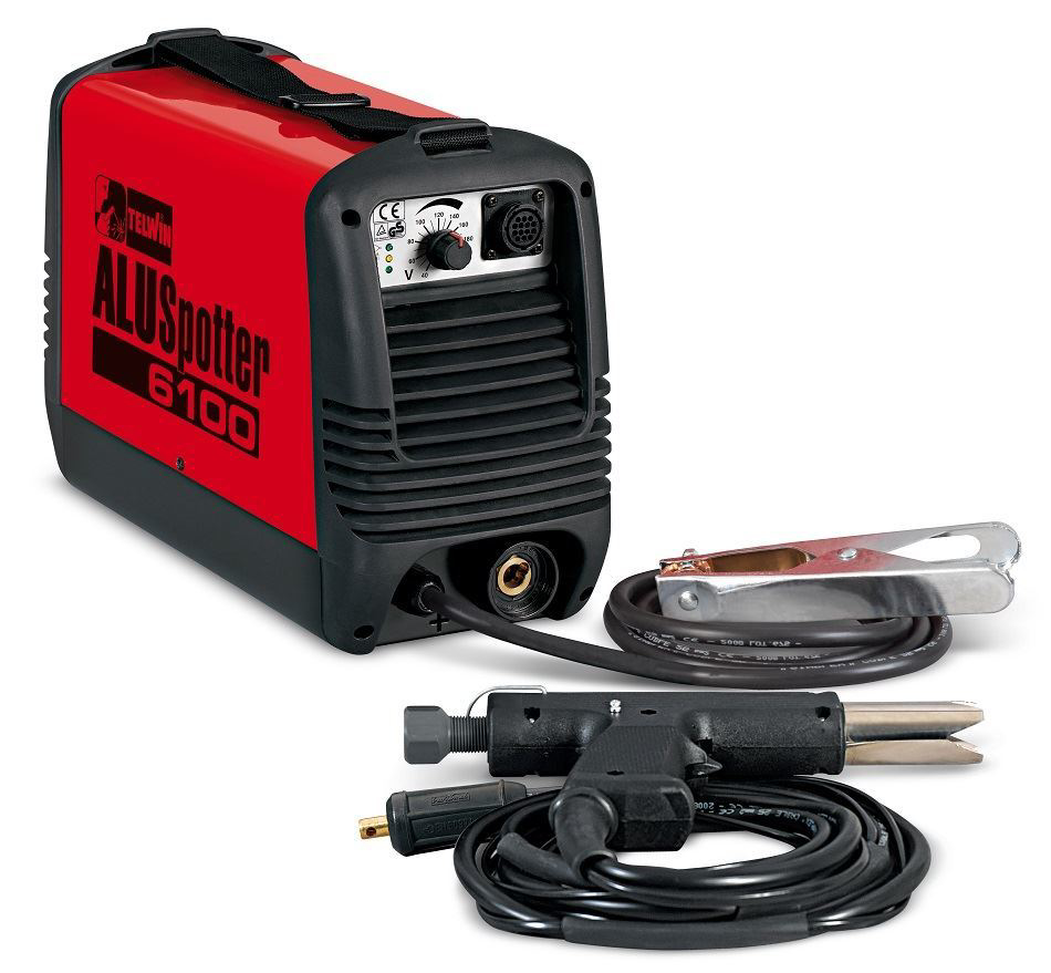 Výbojová bodovací kondenzátorová svářečka Aluspotter 6100 Telwin na principu rychlého kondenzátorového výboje. Vhodná pro bodování šroubů, nýtů průměru 3-8 mm, podložek, kontaktů. Použitelná pro materiály: měkká ocel, hliník, mosaz, pozinkovaný plech, jednostranně lakované nebo oplastované plechy apod.