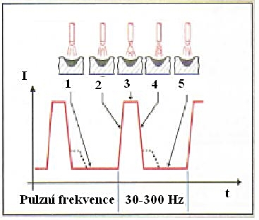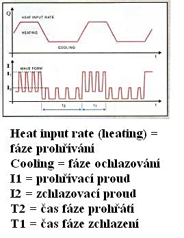 PULSE - je to funkce svářečky, která umí změnit průběh svařovacího proudu na pulsující, pulsy se odehrávají se v kladné půlvně svářecího proudu. Sváření se odehrává v modifikované formě režimu "spray arc". Svářecí proud pulsuje z minimální hodnoty na maximální a frekvence pulsů se dá nastavit. Tuto funkci používají svářečky TIG i svářečky MIG-MAG. Tato funkce umožňuje lépe svařovat tenké materiály. Průběh svařovacího procesu je následující: Zapálí se oblouk ve fázi min. svařovacího proudu a nahřívá se svařenec. V momentě max. hodnoty svářecího proudu dochází k odtavení kapky svářecího drátu (MIG-MAG) a nánosu na svařenec. Pulsace je nastavitelná obvykle v rozmezí 30-300 Hz. Viz obrázek.
