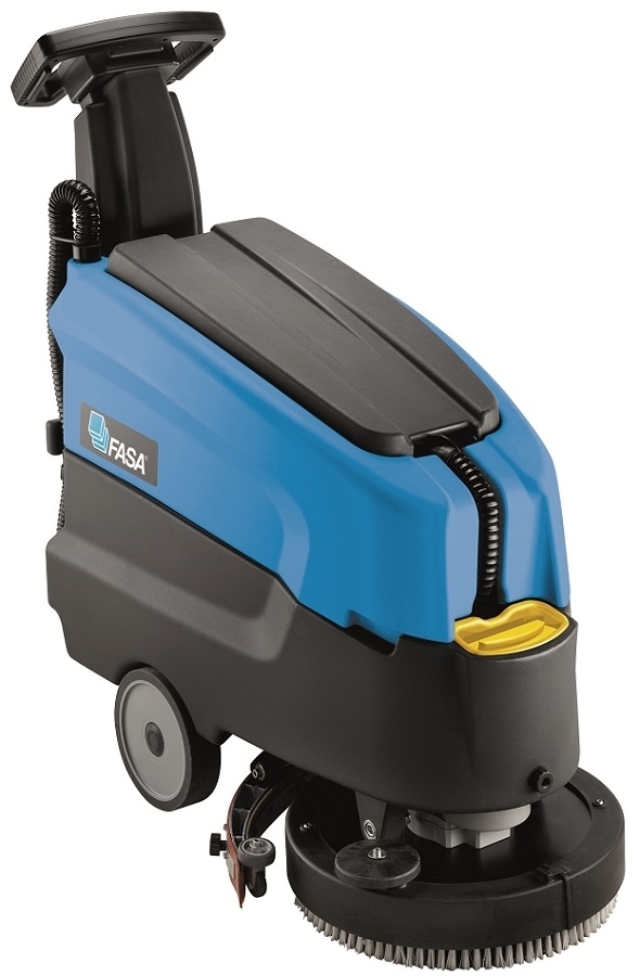 Mycí stroj na podlahu A4 45 B Fasa. Napájení 24 V, mycí záběr 450 mm, délka sušící lišty 540 mm, otáčení na malém prostoru, systém rychlé výměny kotouče. Baterie v základní výbavě.